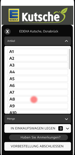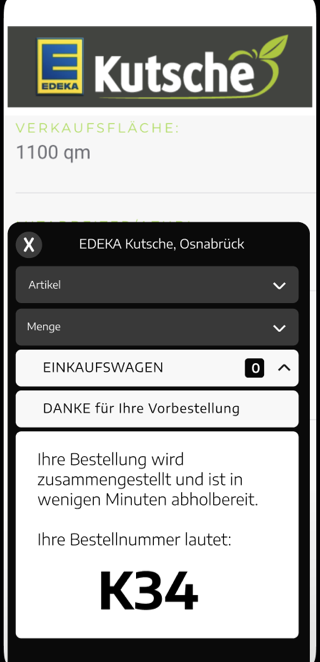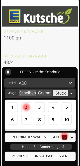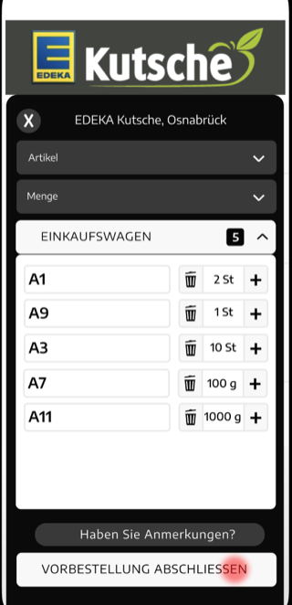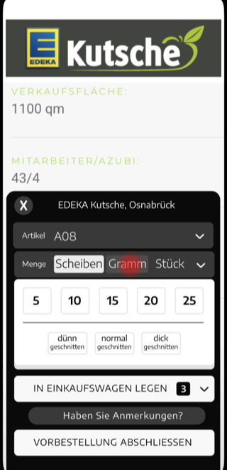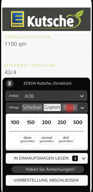 So könnte das Bestellfenster aussehen. Bitte von rechts nach links wischen..