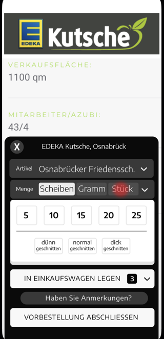 So könnte das Bestellfenster aussehen. Bitte von rechts nach links wischen..